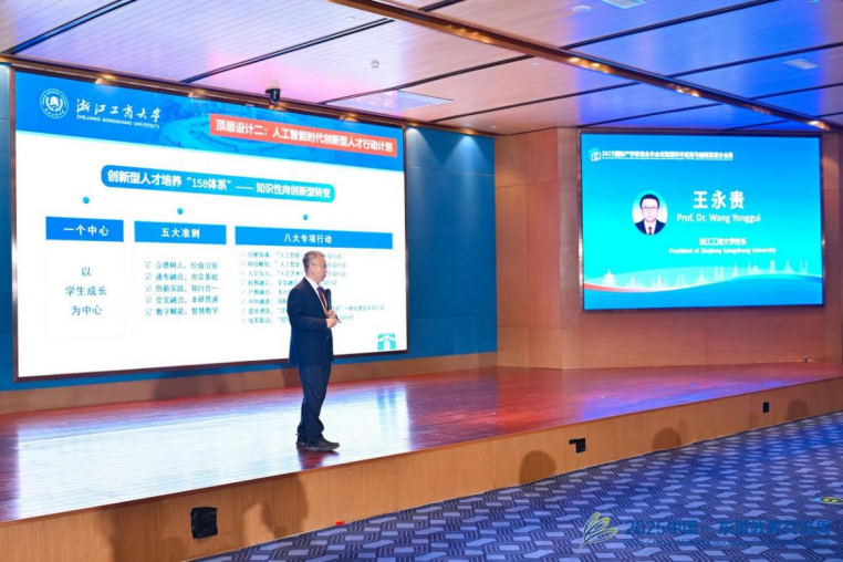 浙江工商大学校长王永贵作主旨演讲,向与会代表详细介绍了浙江工商大学人工智能时代创新型人才行动计划,并从顶层设计、创新举措等方面展示了浙江工商大学在智能时代未来教育的新路径、新范式。