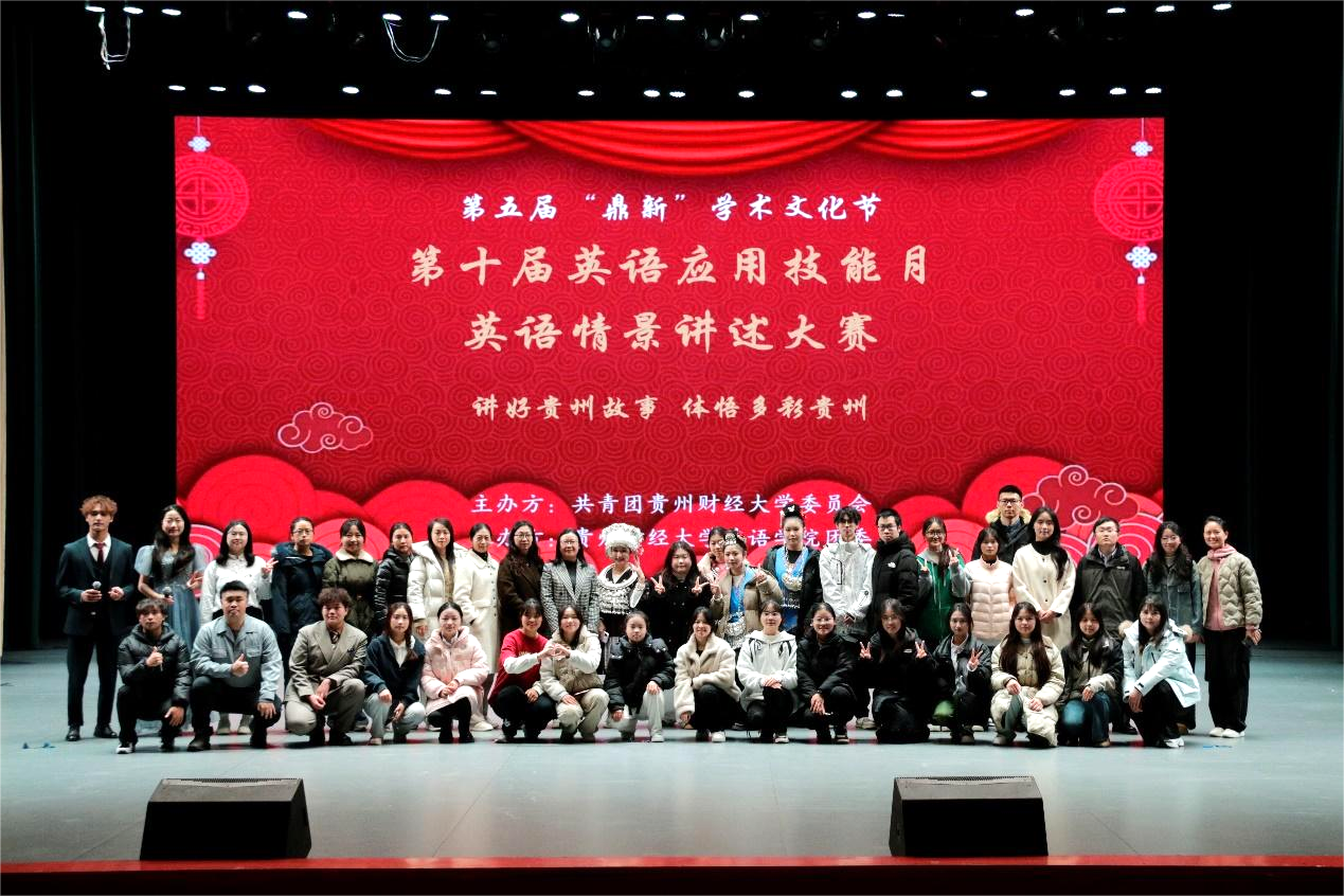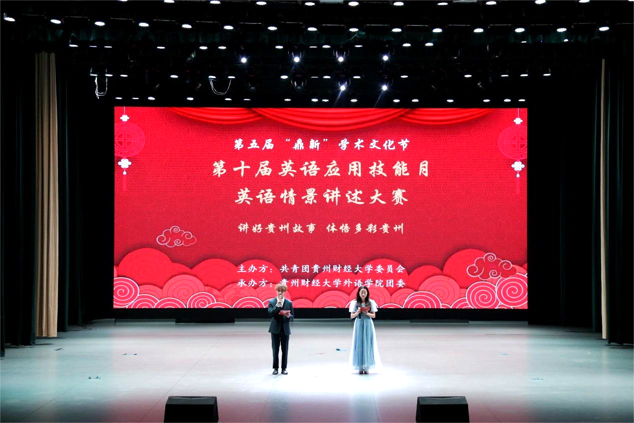 本网讯:(外语学院 田婷 报道|摄影 周之凯)由学报编辑部、校团委承办、外语学院团委协办的第五届“鼎新”学术文化节之第十届"英语应用技能月"——英语情景讲述大赛决赛于11月18日在学生活动中心大礼堂圆满落幕。本次比赛的主题为:讲好贵州故事,体悟多彩贵州。
