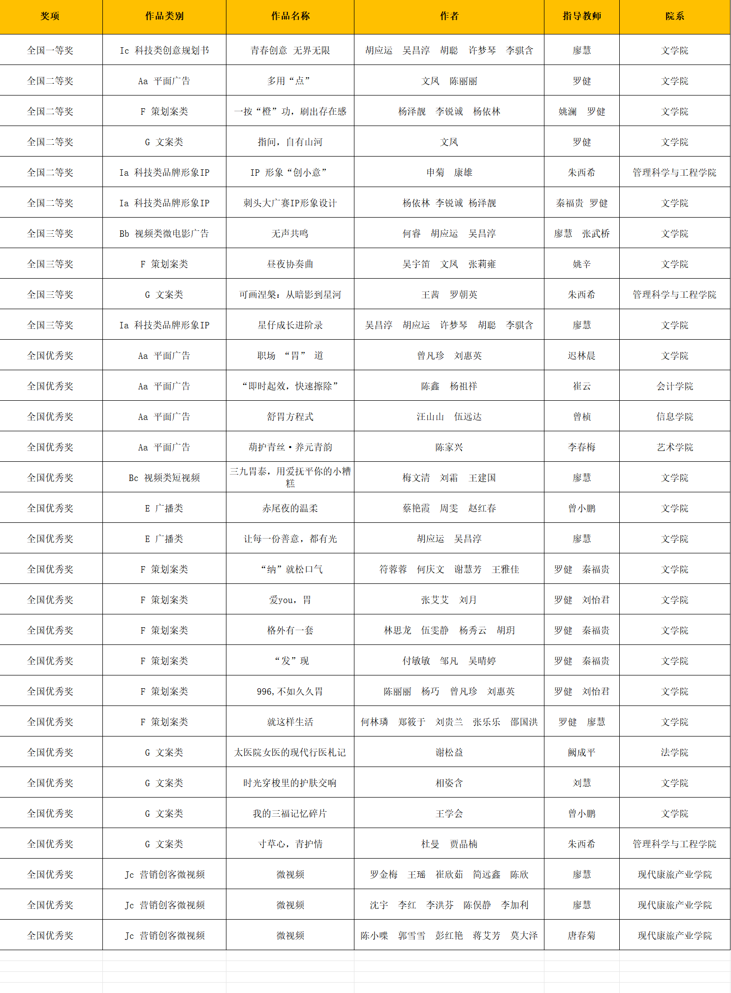 本网讯:(文学院 廖慧 报道)近日,“中国大学生好创意”第十七届全国大学生广告艺术大赛(以下简称:大广赛)全国总评审工作已圆满结束。我校参赛团队凭借出色的表现斩获国家级一等奖1项,二等奖5项,三等奖4项,优秀奖20项,刷新我校在该赛事中的历史最佳成绩。