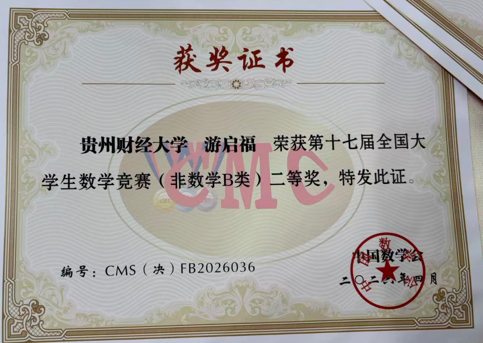 本网讯:(数学与统计学院、大数据统计学院 舒亚东 图文报道4月19日,第十七届全国大学生数学竞赛决赛圆满落幕。我校应用经济学院24级本科生游启福凭借扎实的数学功底与出色的临场发挥,在非数学专业组B类比赛中脱颖而出,荣获全国二等奖,为学校争得荣誉。