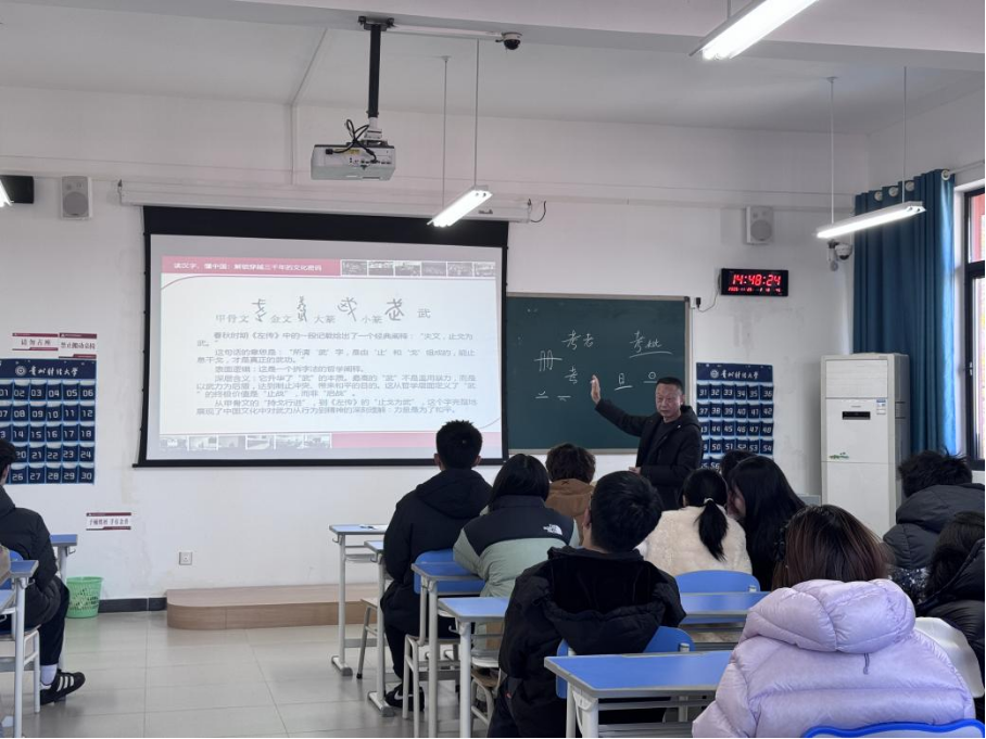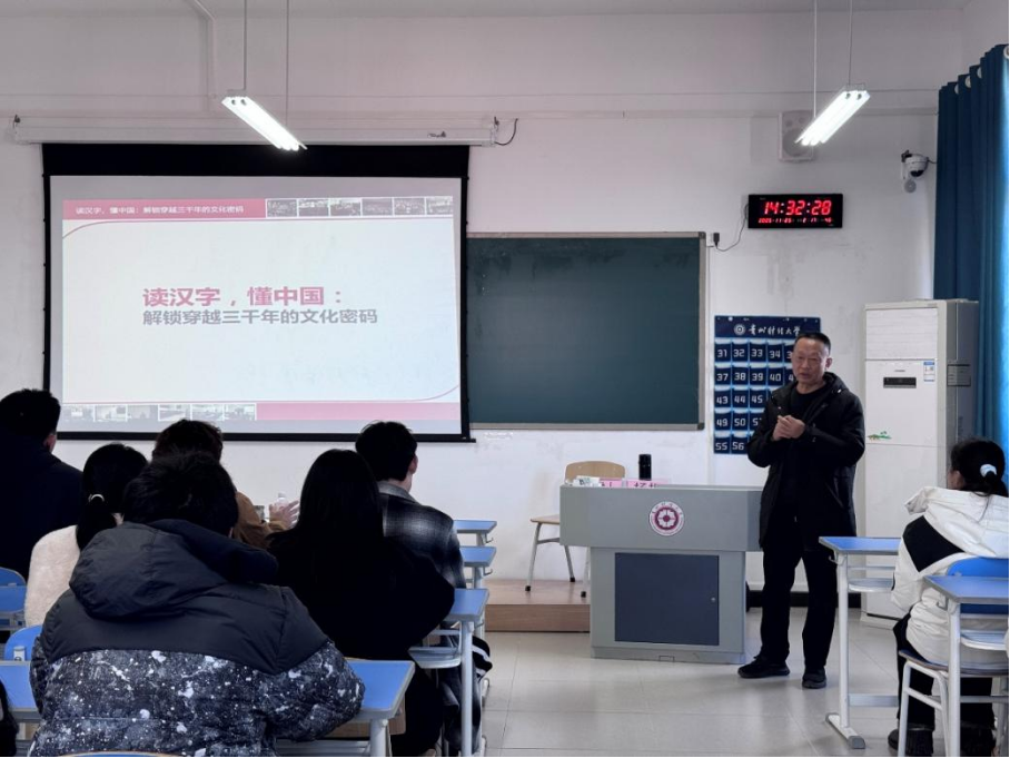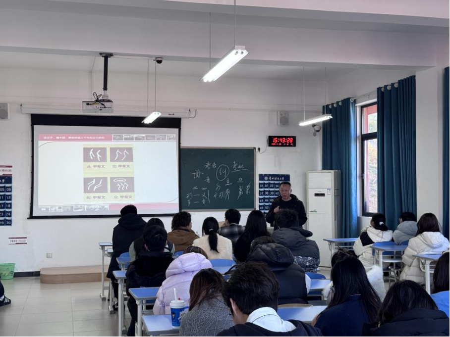 讲座中,杨枫梳理了汉字从结绳、契刻到画画记事的起源,强调其跨时空传承的特性与文化载体价值;讲解了东汉许慎“六书”造字体系,阐释了象形、指事等六种造字方法的核心内涵;还深度剖析“国”“家”及“国家”的甲骨文本义与文化寓意,展现了汉字中蕴含的家国情怀与传统理想。他强调,读汉字不仅是识字,更是与祖先对话,感悟其处世治世的深远智慧。希望各位学生通过汉字筑牢文化自信,为中外合作办学背景下传播中国声音、讲好中国故事奠定了坚实的文化基础。